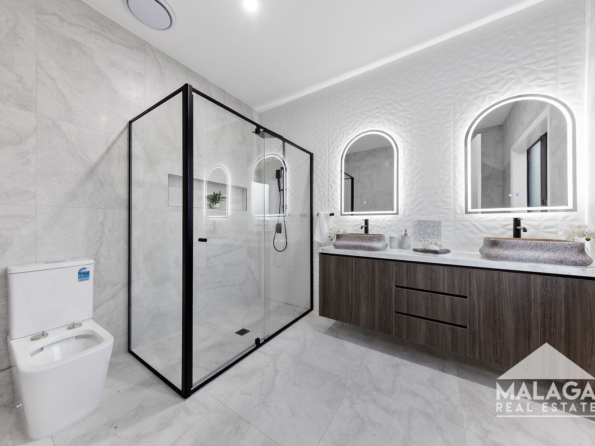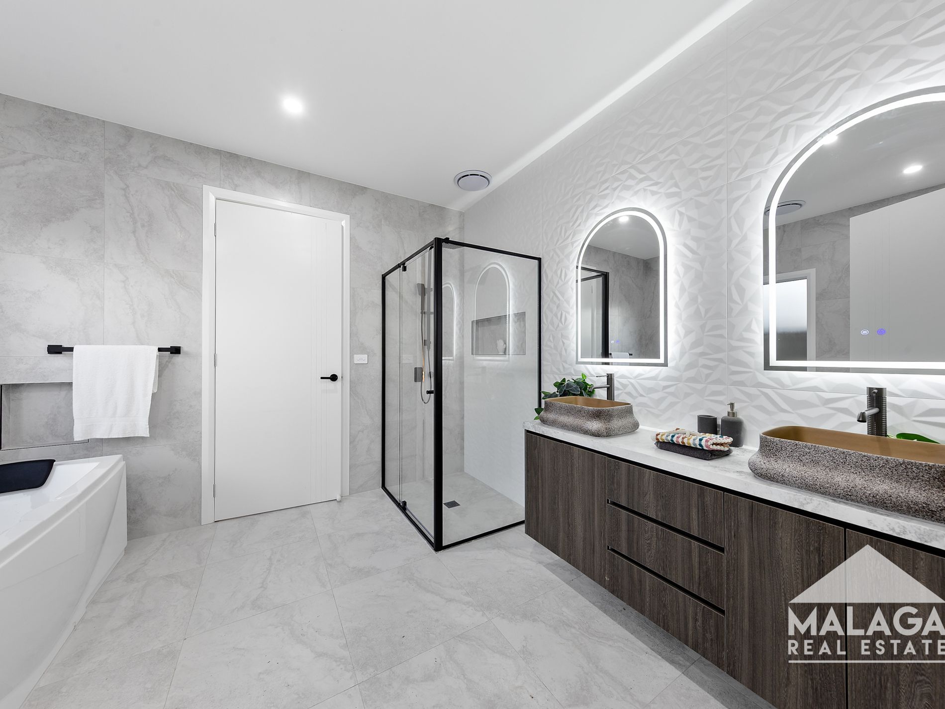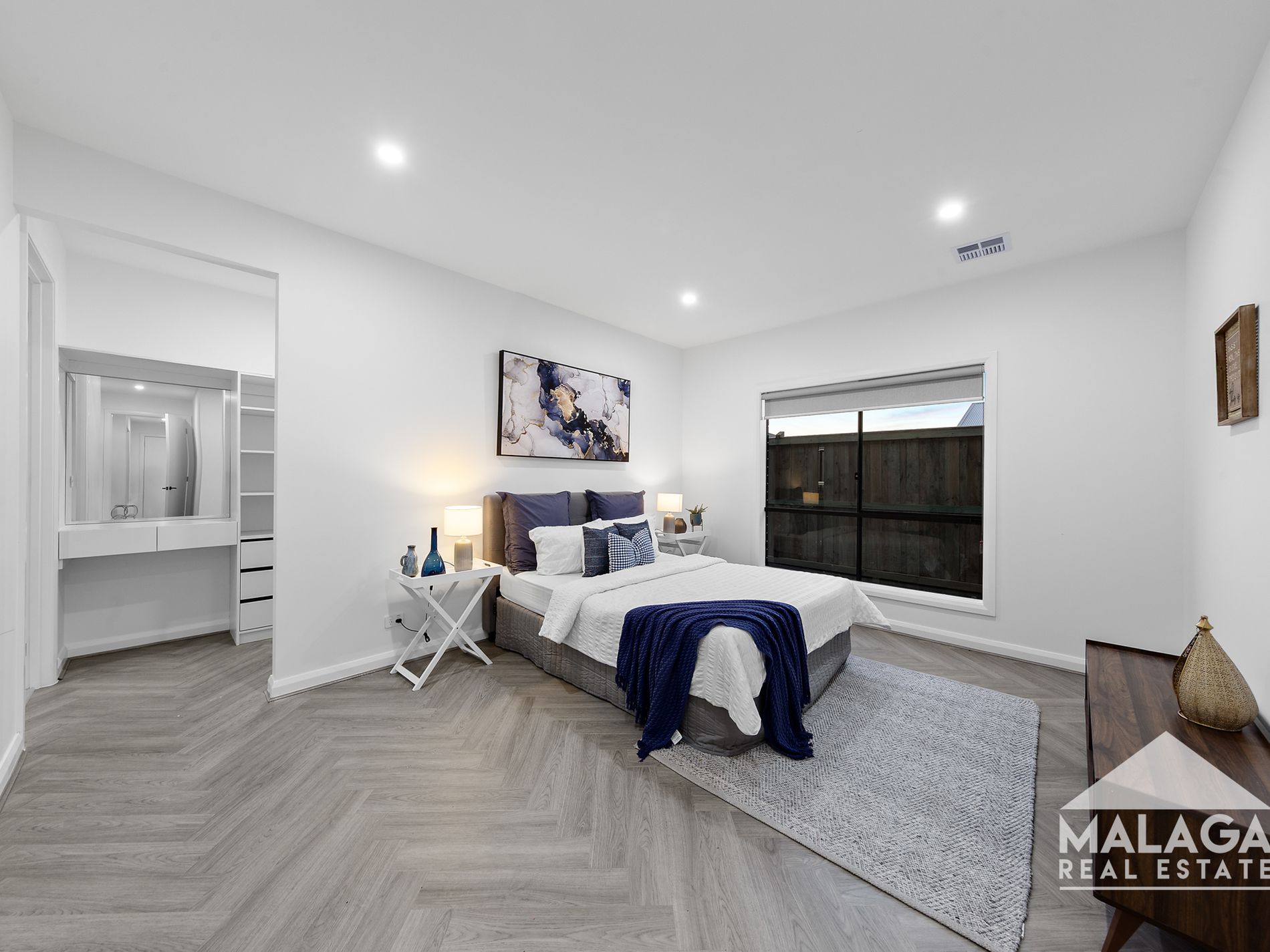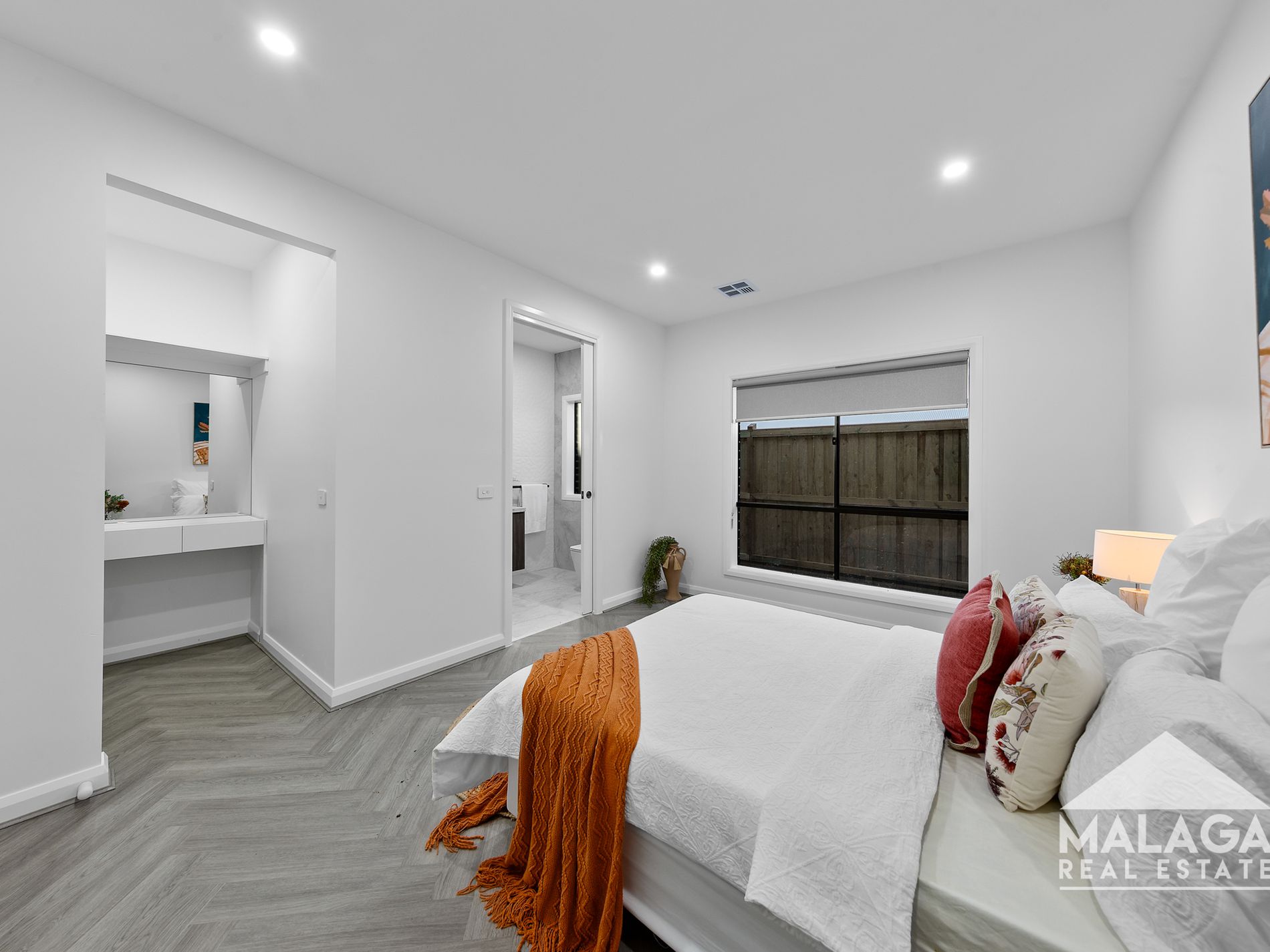 The home accommodates four generously proportioned bedrooms, highlighted by a luxurious master suite featuring a grand double-door entry, spacious walk-in robe and a sophisticated ensuite complete with an oversized niched shower and twin stone-topped vanity. The remaining bedrooms include built-in robes and are serviced by a stylish central bathroom with shower, bath and separate toilet.