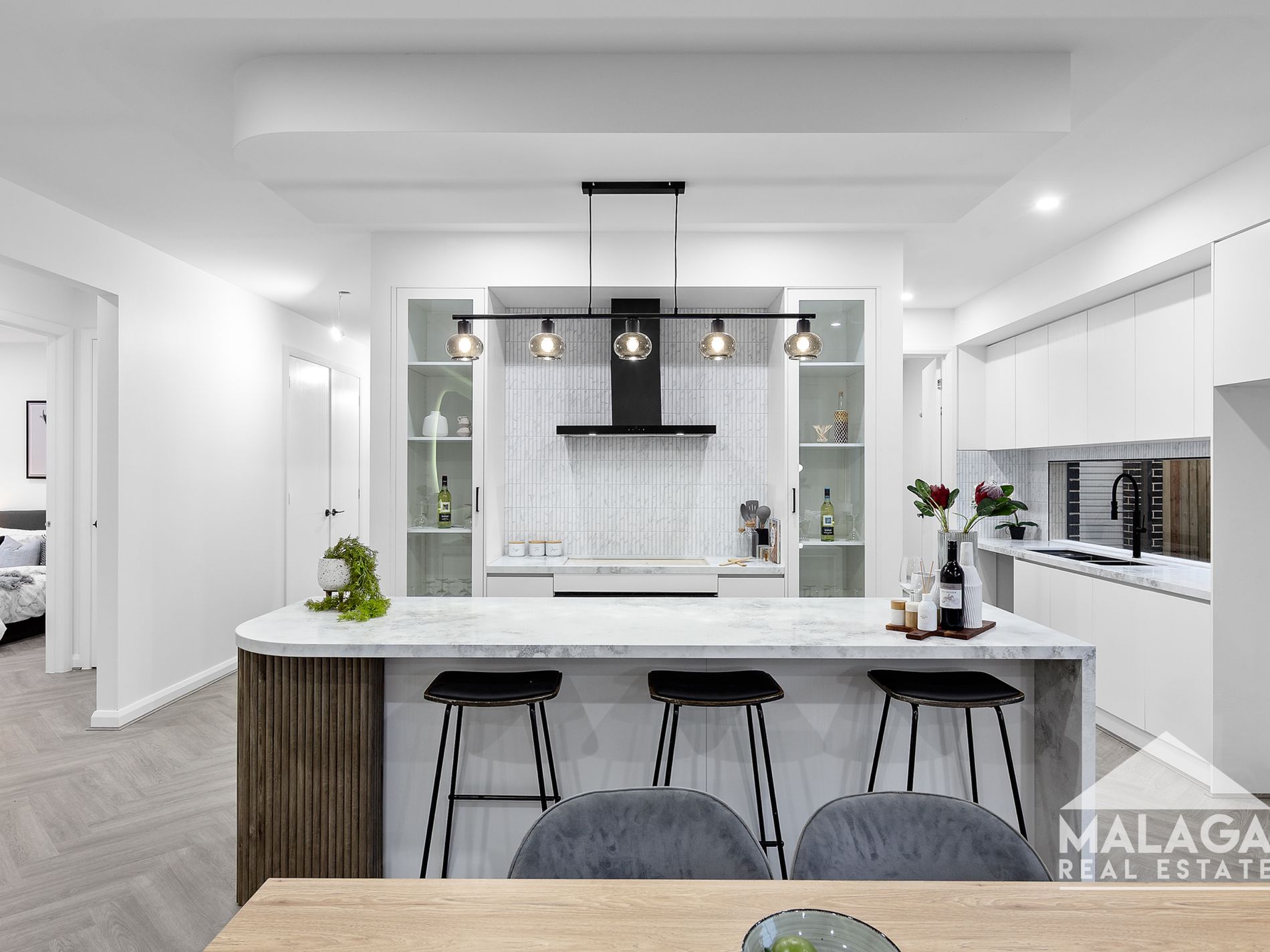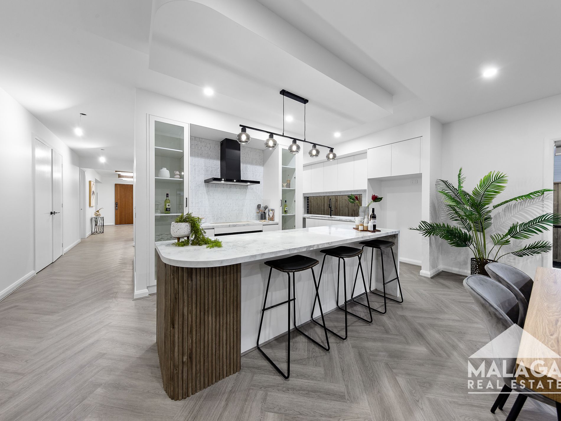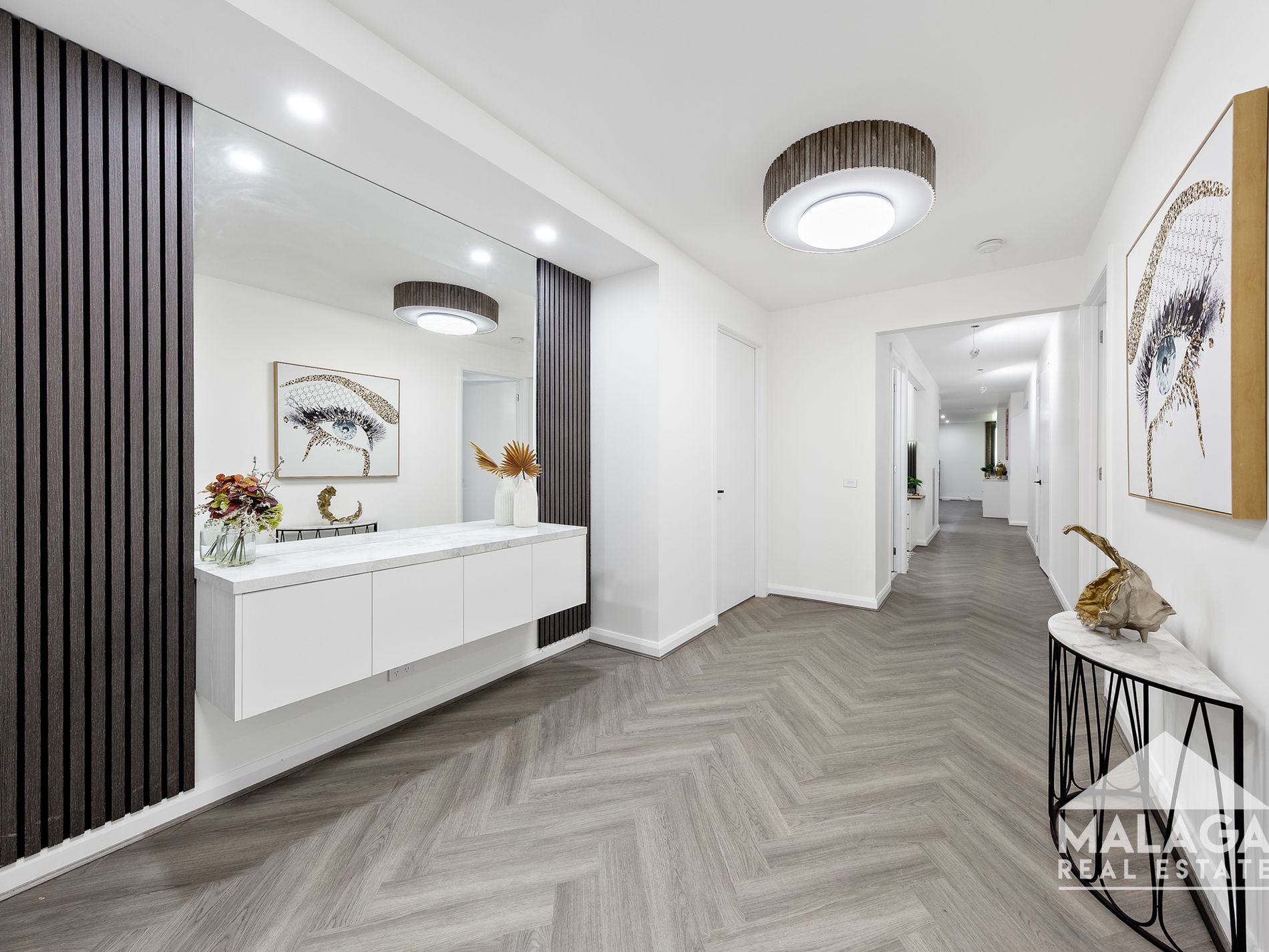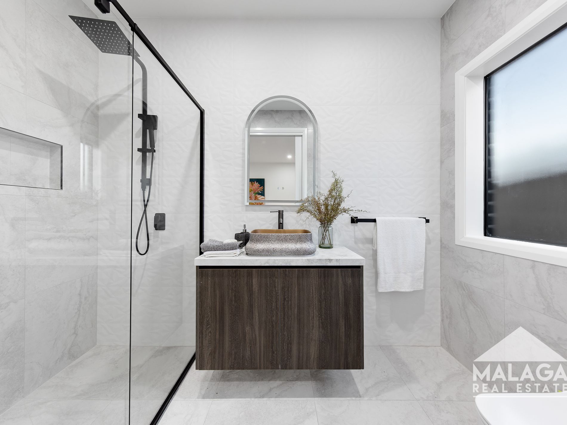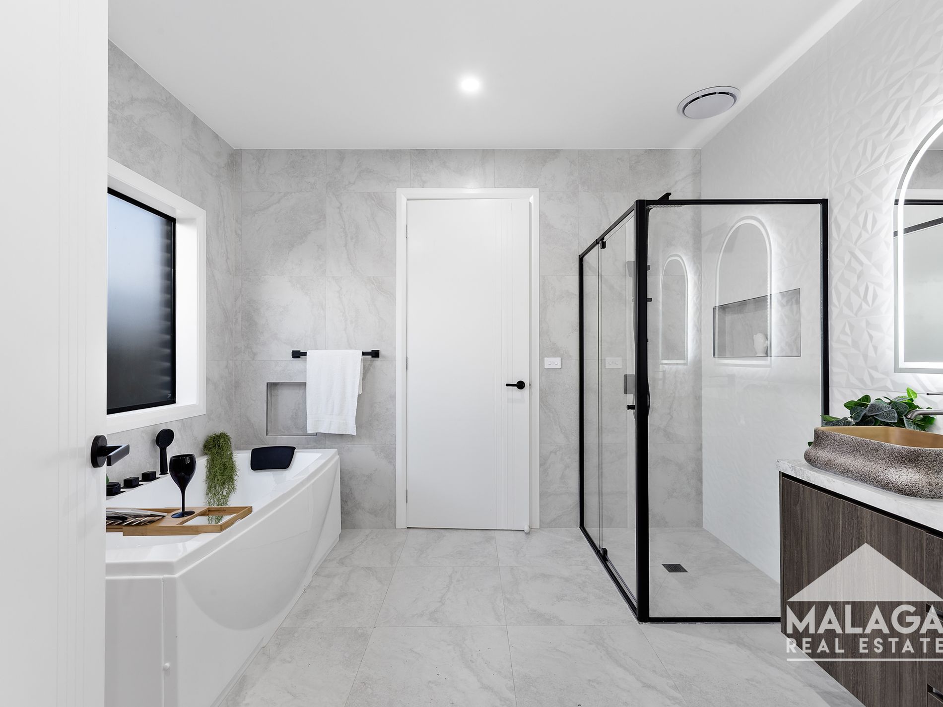 The home accommodates four generously proportioned bedrooms, highlighted by a luxurious master suite featuring a grand double-door entry, spacious walk-in robe and a sophisticated ensuite complete with an oversized niched shower and twin stone-topped vanity. The remaining bedrooms include built-in robes and are serviced by a stylish central bathroom with shower, bath and separate toilet.
