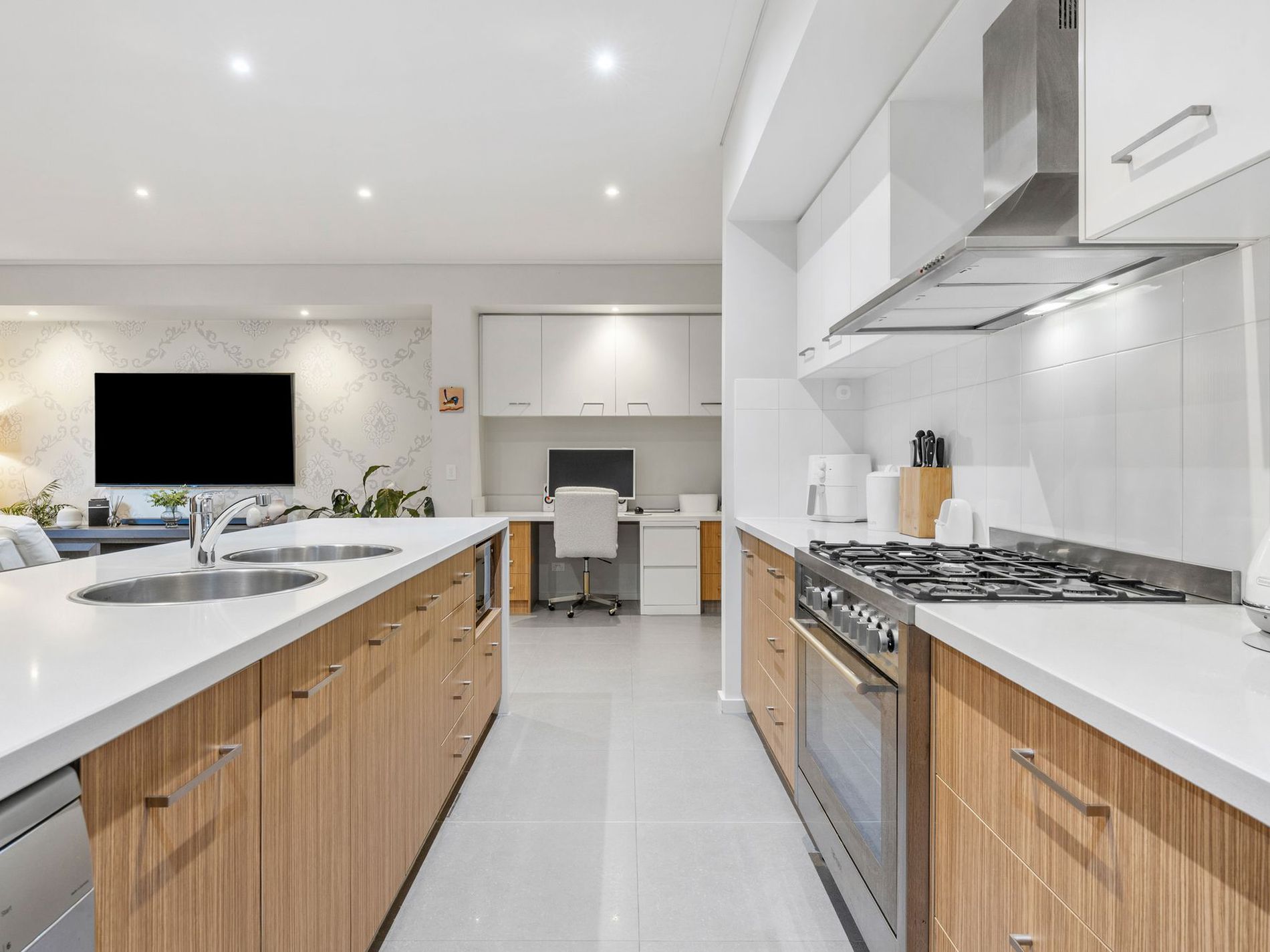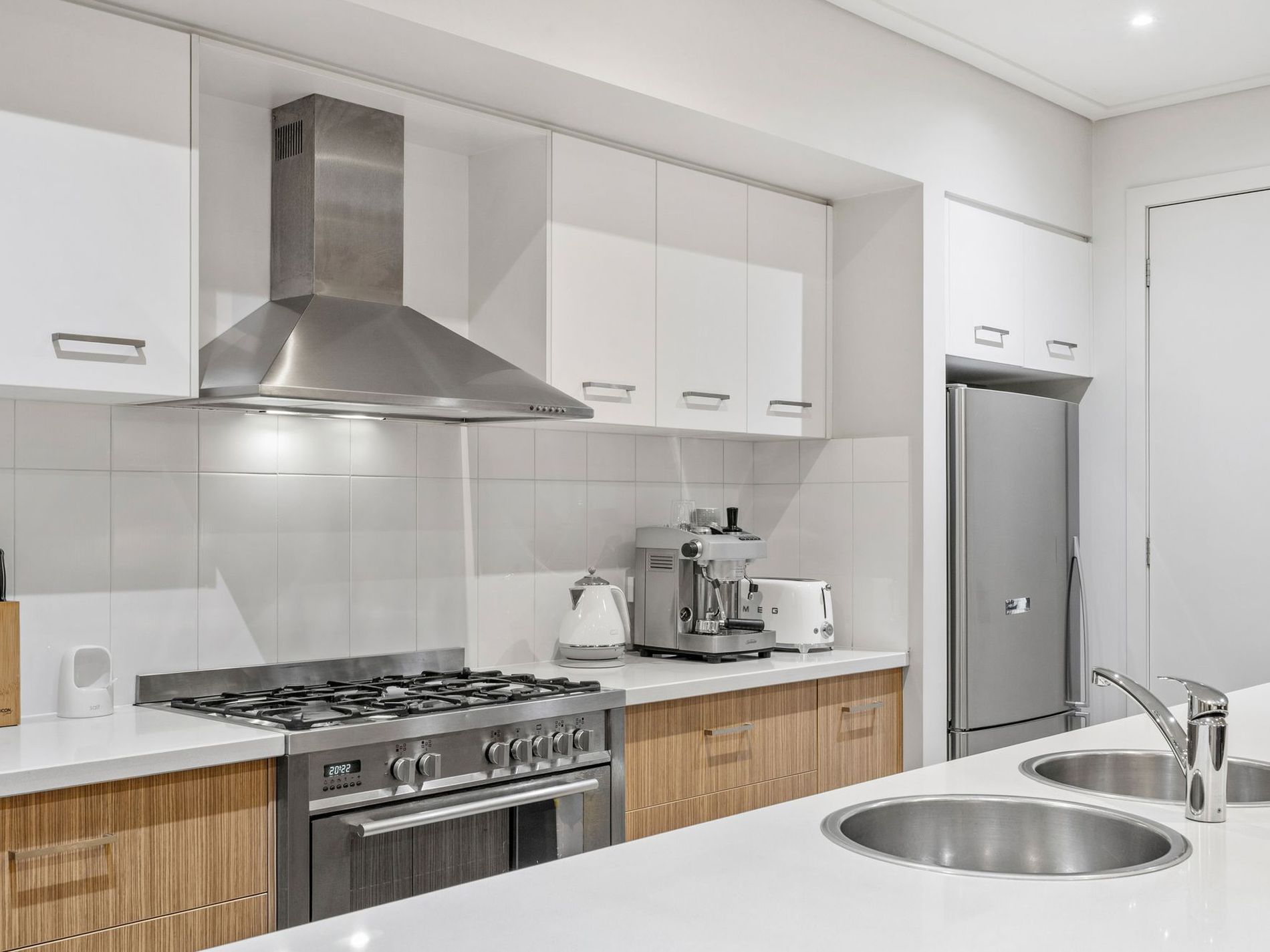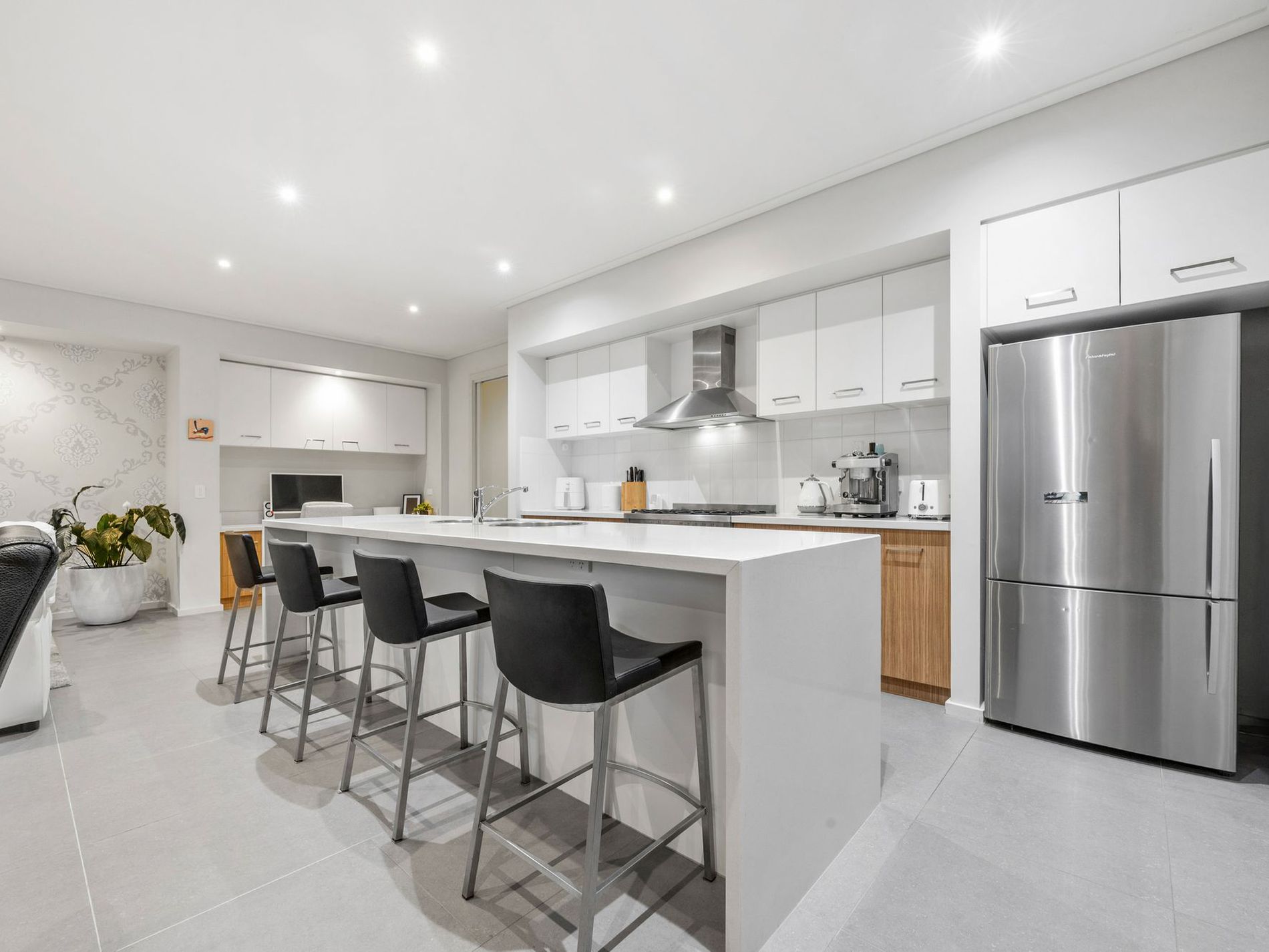 At the heart of the home, the designer kitchen boasts sleek stone benchtops, quality stainless-steel appliances, dishwasher, and ample storage — seamlessly overlooking the open-plan living and dining domain. Large sliding doors extend the space outdoors to a beautifully decked alfresco area, creating the perfect environment for entertaining year-round.